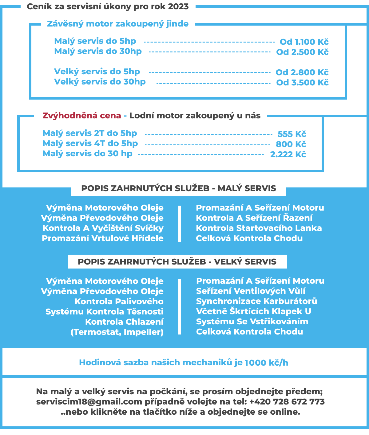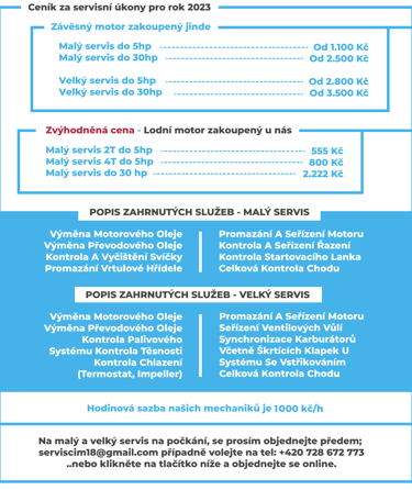 Mnoho lidí pravidelnou údržbu podceňuje. Stává se nám často, že k nám přijede zákazník s poruchou, které šlo předejít. Opravy z důvodu nefunkčního chladícího systému, převodovky, palivového systému apod. bývají drahé a přitom se jim opravdu dá předejít. Někdy se takový motor už ani nevyplatí uvádět zpět do provozu. Například cena samotné převodovky HONDA-25 převyšuje padesátitisícovou částku. Pravidelný servis lodních motoru je velmi důležitý, zejména u motorů používaných ve slané vodě.